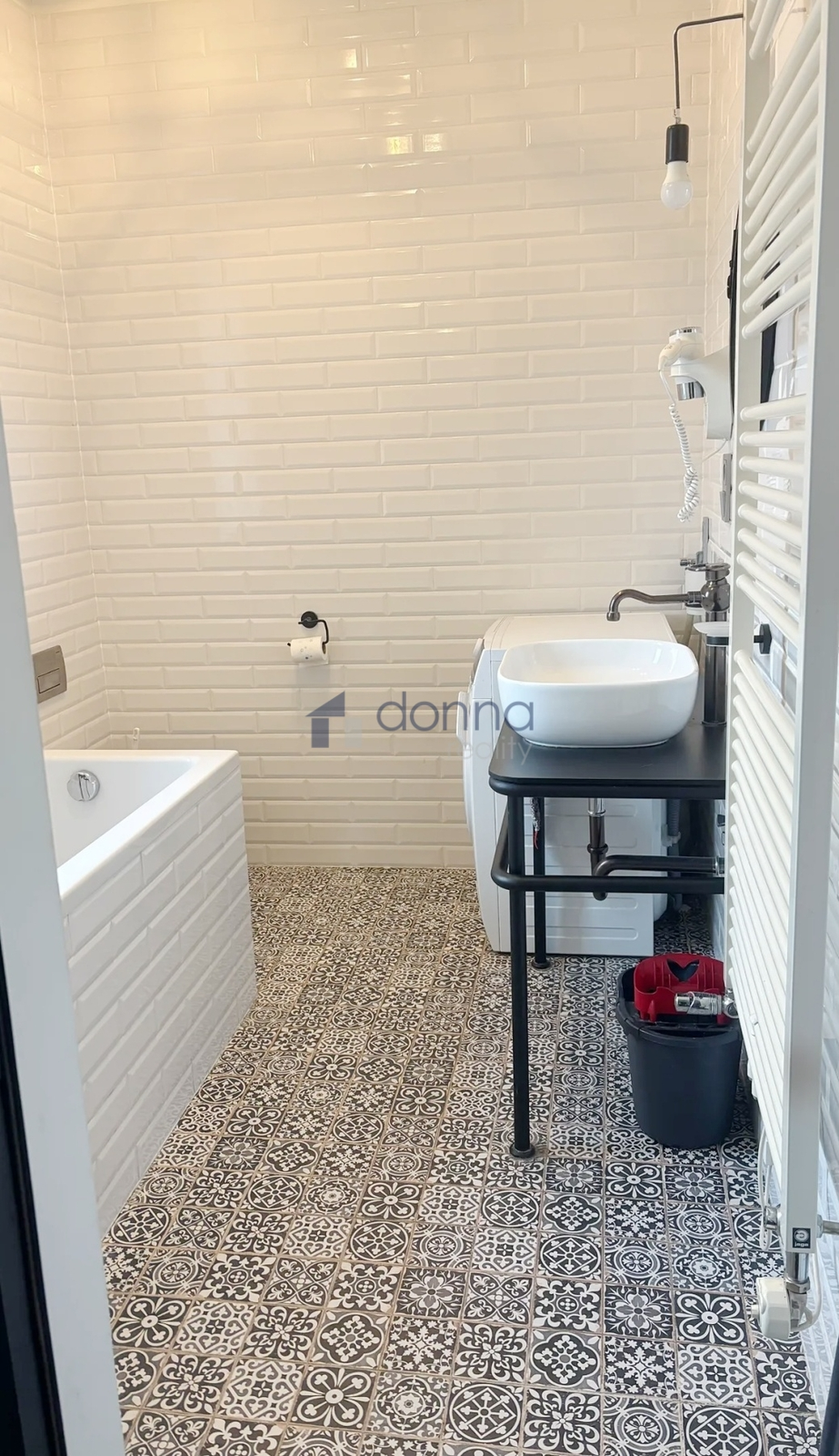 V koupelně s oknem a nádherným výhledem je velký sprchový kout, WC s bidetem, pračka se sušičkou schovaná ve skříni.