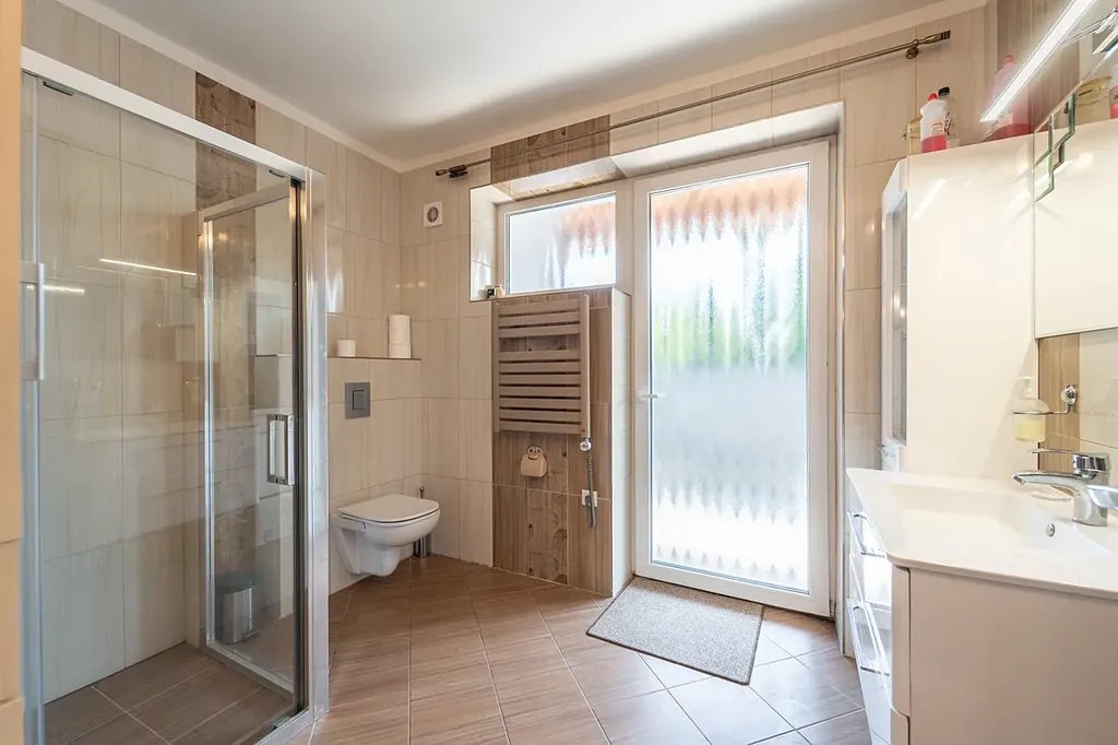Dům je cihlový (Porotherm) a zateplený (40+10). V domě se nachází prostorná hala se světlovody, které do domu přivádí denní světlo zvenku. Dále pak dispozici tvoří kuchyně s velkým jídelním prostorem, obývací pokoj s velkoformátovými okny, ze kterého je přímý vstup na terasu a zahradu se zapuštěným nevytápěným bazénem 1,5x3x5m. Dům disponuje třemi neprůchozími pokoji, praktickou šatnou a dvěma koupelnami. Jedna koupelna je s vanou a druhá se sprchovým koutem a vstupem na menší terasu s posezením a orientací na východ. Na halu navazuje chodbička do další místnosti, kterou lze využít jako obývací místnost nebo pracovnu, a do technické místnosti, kde se nachází tepelné čerpadlo, zásobník teplé vody, pračka, sušička apod., dále je zde vstup do garáže. V zadní části domu se nachází hlavní vstup do domu a chodbička, ze které vede výsuvný žebřík na pochozí půdu. Dům má okna-trojskla (AR Okenní technika).