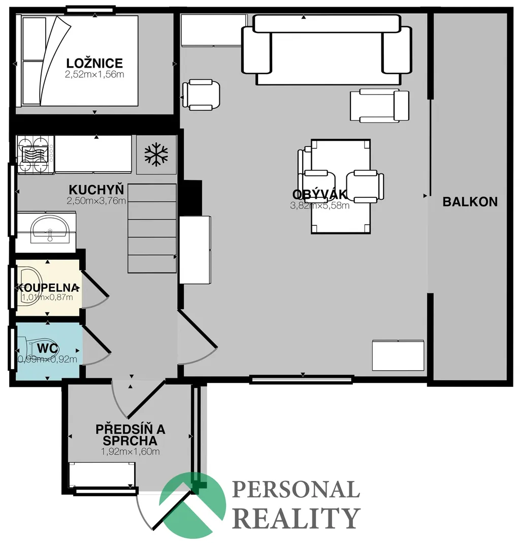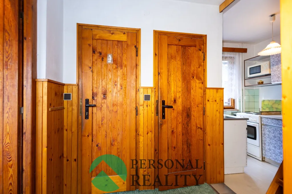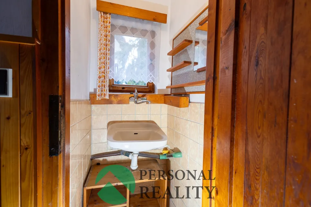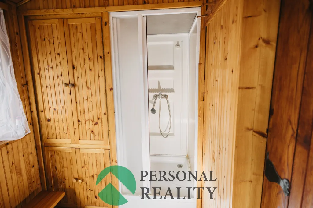 Dispozice přízemí: předsíň, sprchový kout, samostatné splachovací WC, koupelna s umyvadlem, chodba, kuchyně, menší ložnice a obývací pokoj se vstupem na prostornou terasu.