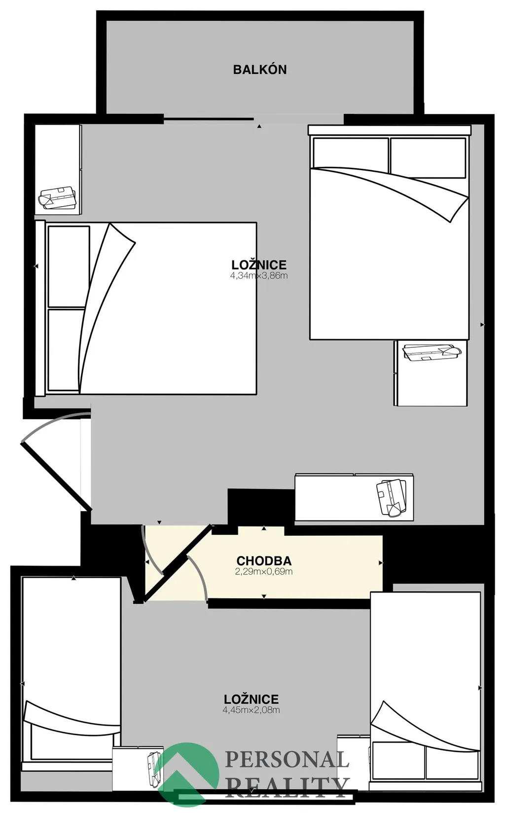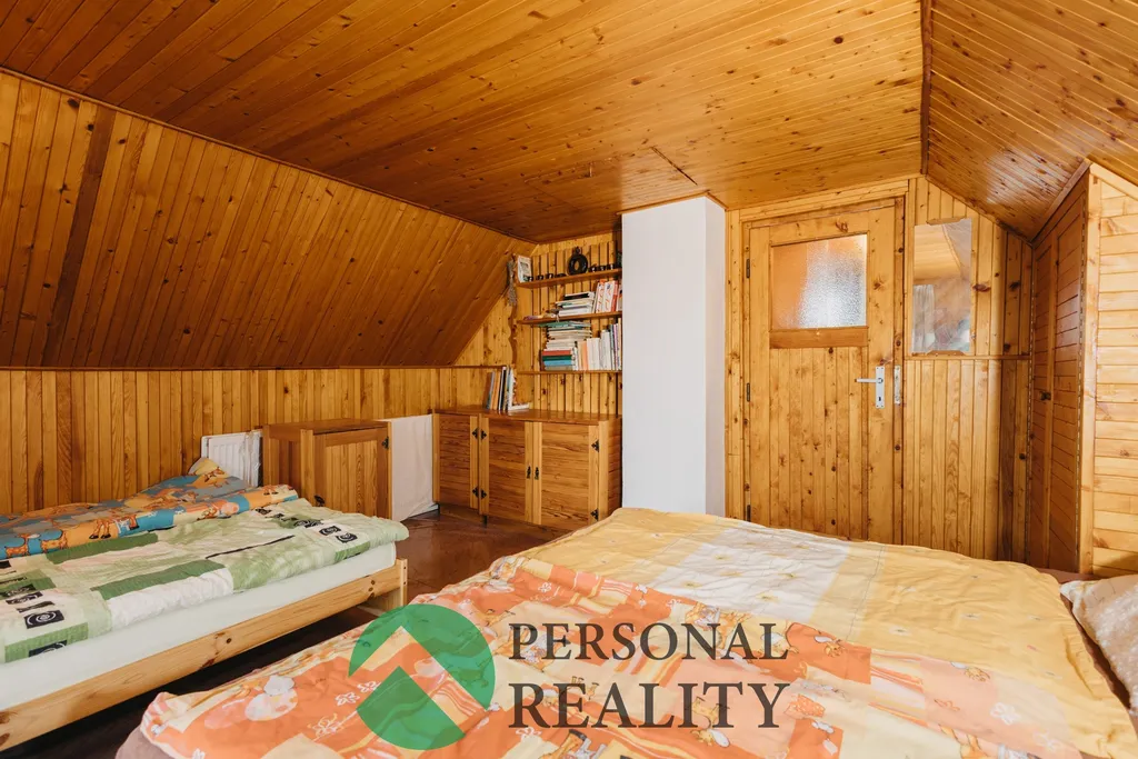 Dispozice horní patro: chodba se vstupem na půdní prostor, dětský pokoj a větší ložnice se vstupem na balkón a krásným výhledem do okolní krajiny směrem k Orlické přehradě.