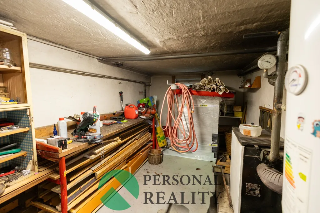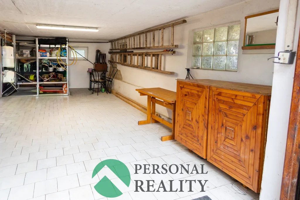 Ve spodní části chaty se nachází prostorná garáž a technická místnost, kde je kotel na tuhá paliva.