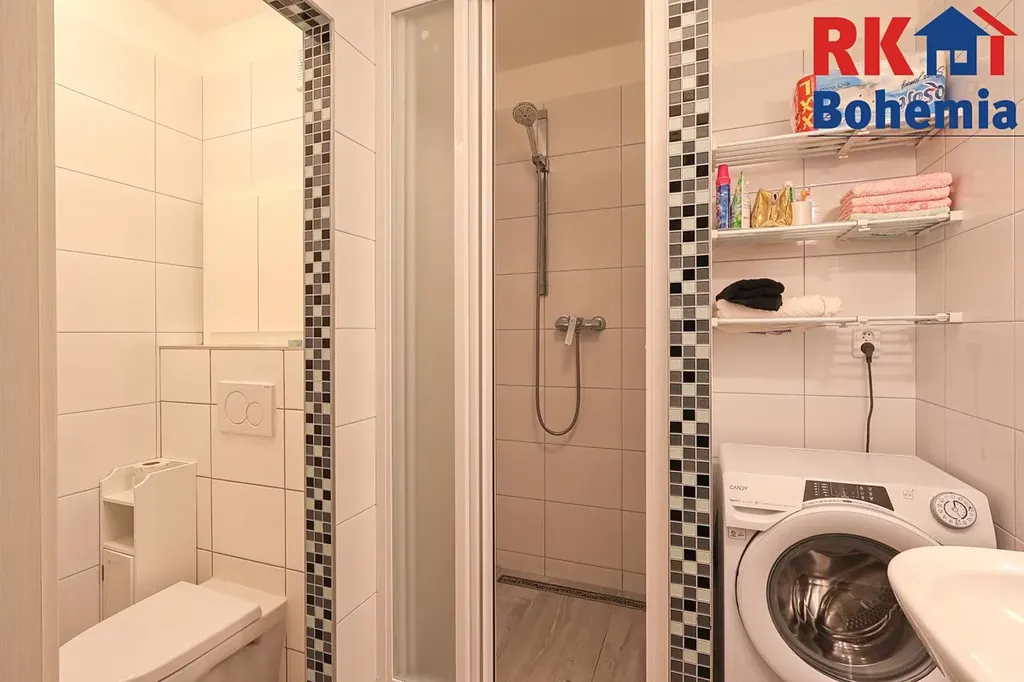 - Moderní kuchyňská linka se spotřebiči (sklokeramická deska, el. trouba, myčka), koupelna se zděným sprchovým koutem a pračkou.