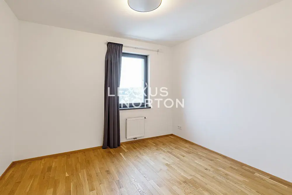 Vstupní chodba poskytuje dostatek úložného prostoru díky vestavěným skříním. Kuchyňský kout je plně vybaven moderními spotřebiči – indukční varnou deskou, troubou, lednicí s mrazákem a myčkou nádobí. Byt disponuje dvěma koupelnami: první je vybavena vanou a toaletou, druhá nabízí sprchový kout a toaletu. Standard bytu zahrnuje dřevěné podlahy, zatemňovací závěsy a záclony. Francouzská okna poskytují maximální množství denního světla a příjemně prosvětlují celý interiér. Samozřejmostí je také rekuperace zajišťující stálý přísun čerstvého vzduchu a interkom s kamerou pro vyšší komfort a bezpečnost.