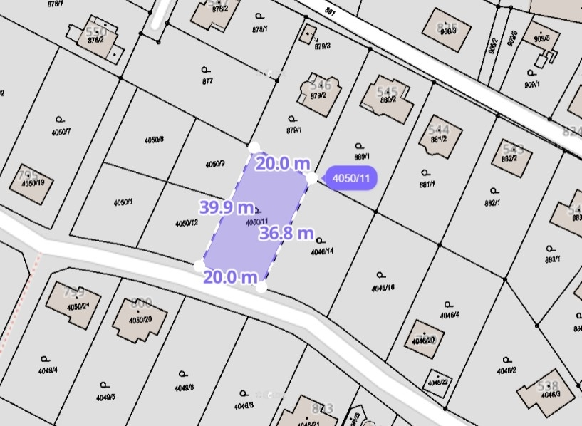 Pozemek má ideální velikost, která nabízí dostatek prostoru pro rodinný dům i zahradu podle vašich představ. Velkou výhodou je skutečnost, že všechny přípojky jsou již připravené, což výrazně zjednodušuje a urychluje zahájení výstavby. Pozemek je vedený jako parcela č. 4050/11. Rozměr pozemku je cca šířka 20 m a délka 38 m.