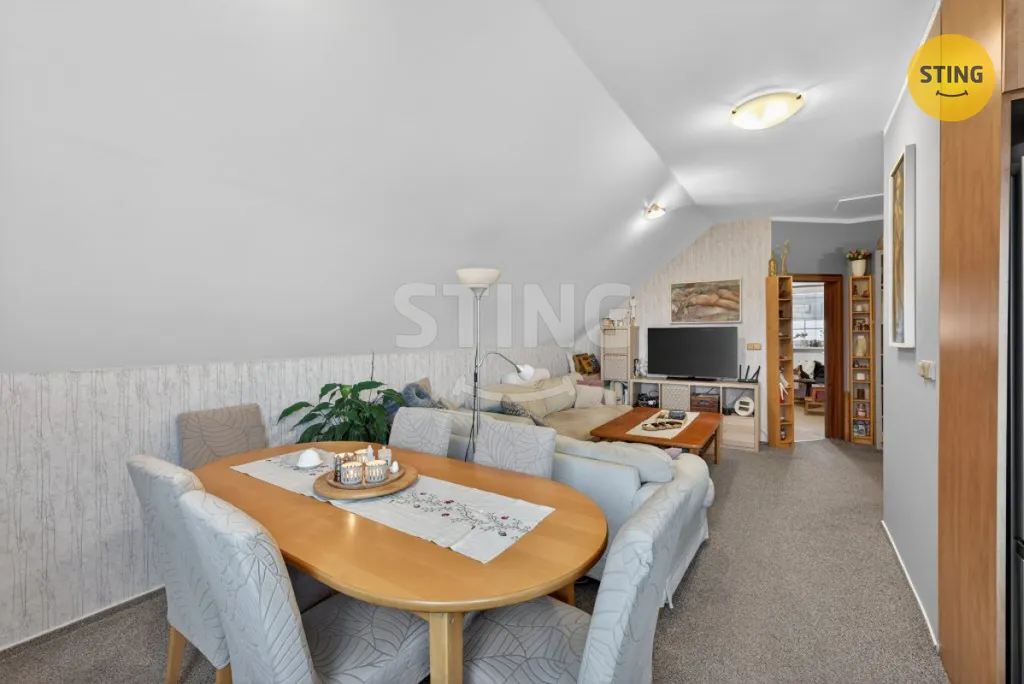 Druhé podlaží domu tvoří útulný obývací pokoj s jídelním koutem, kuchyně, tři samostatné neprůchozí pokoje, koupelna a praktická komora.