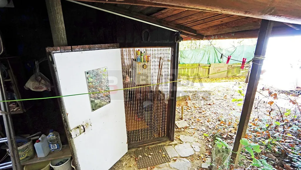 V chatě je hliníkový žebřík a náhradní plachty na plot. Pod postelí v obytné místnosti je el. pila.