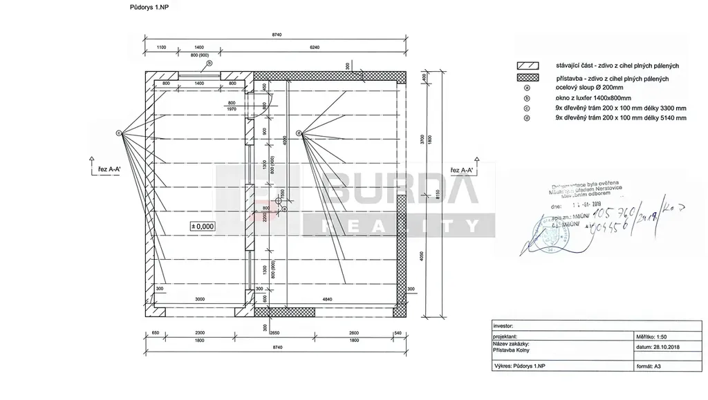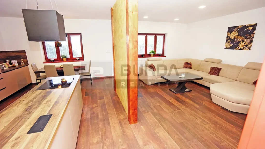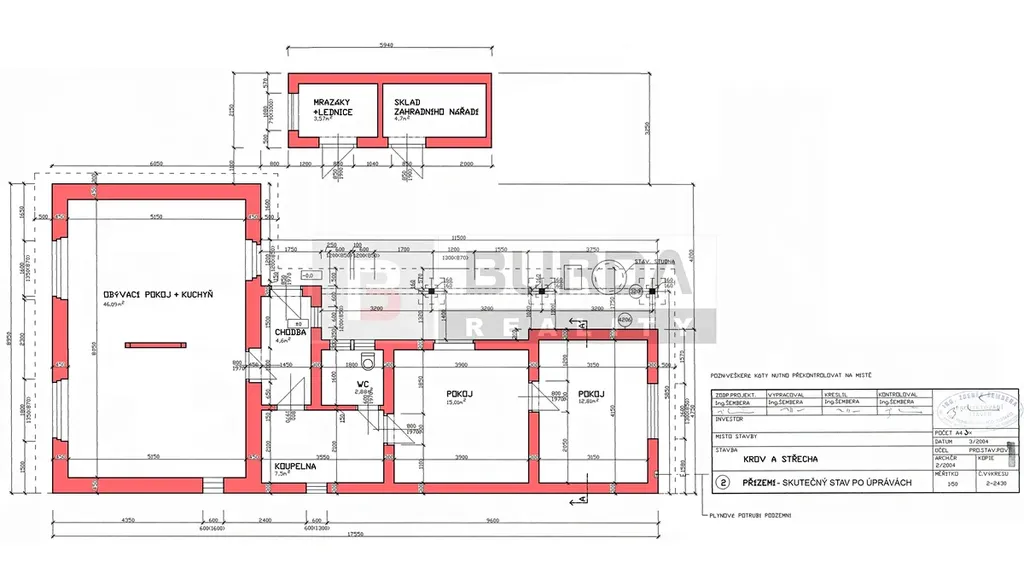Půda nad obýv. pokojem je vhodná pro vestavbu 2 pokojů cca 40 m2, lze propojit vnitřními schody v obývacím pokoji.