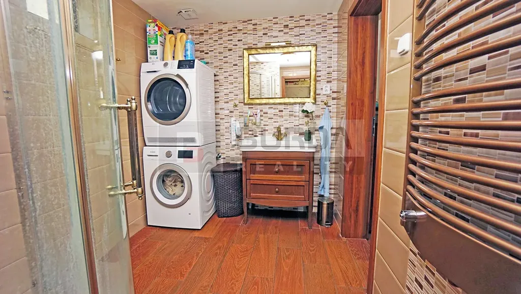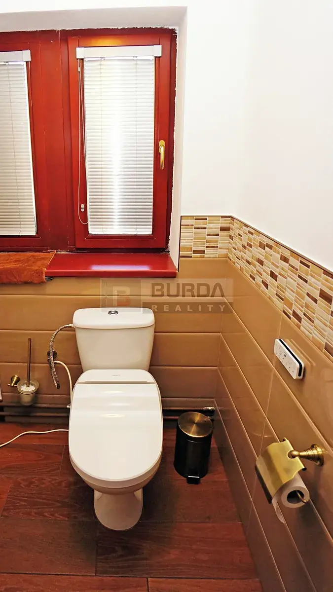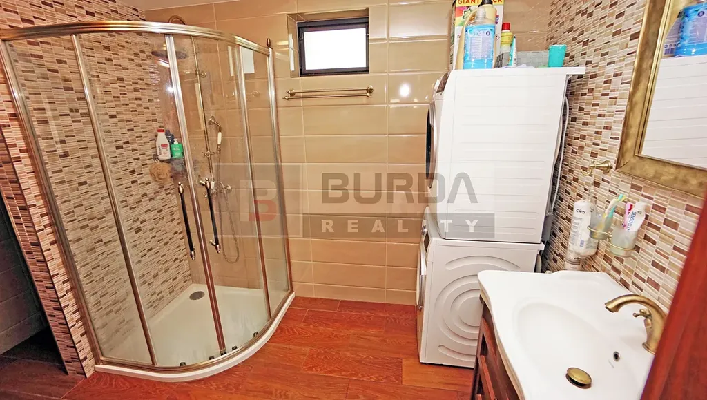 Zařizovací předměty v koupelně jsou ze Sapho koupelny, série Antea, sprchový kout 90 x 90 cm se spec. sklem, baterie Antic, umyvadlo s masivní skříňkou, topný žebřík, samostatné WC s bidetovým sedátkem USPA s dálkovým ovladačem (lze zanechat). Přípojky pro pračku a sušičku (vedle přípojek je příprava pro vanu – odpad a voda). Pračka ani sušička nezůstane.