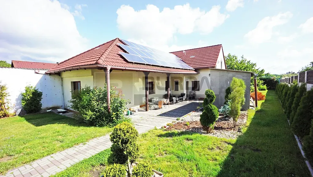 Střechu tvoří beton. krytina KM Beta se střešními solárními panely Eko-Eko Top s.r.o. (vedeno smluvně na původního majitele, kterému ČEZ platí 13,50 Kč/kWh, vydělává cca 50-60 tis. Kč na dům za rok).