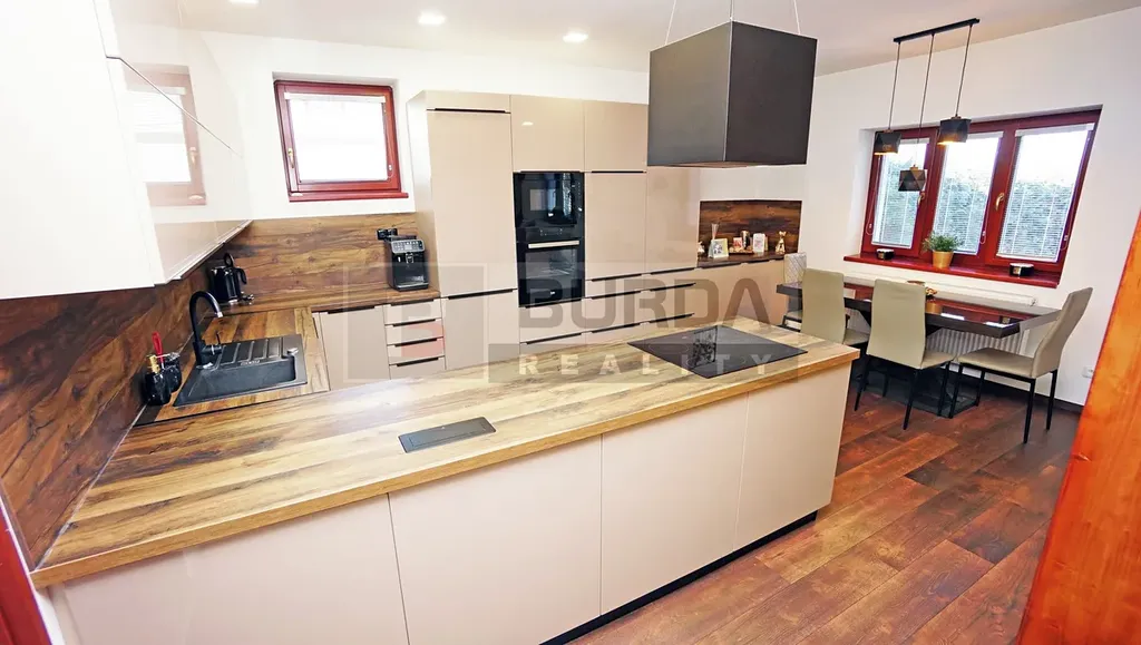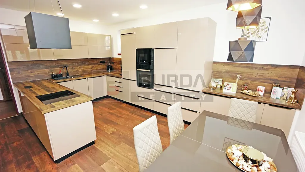 Kuch. linka je vyrobena na míru, v lesklém laminu v odstínu capuccino, s prostornou pracovní plochou s dostatkem místa pro vaření s granitovým dřezem Alveus a s vestavěnými spotřebiči: myčka, lednice, mrazák Whirpool, menší lednice Amica, trouba, mikrovlnka a sklokeramická deska Beko a digestoř Klarstein.