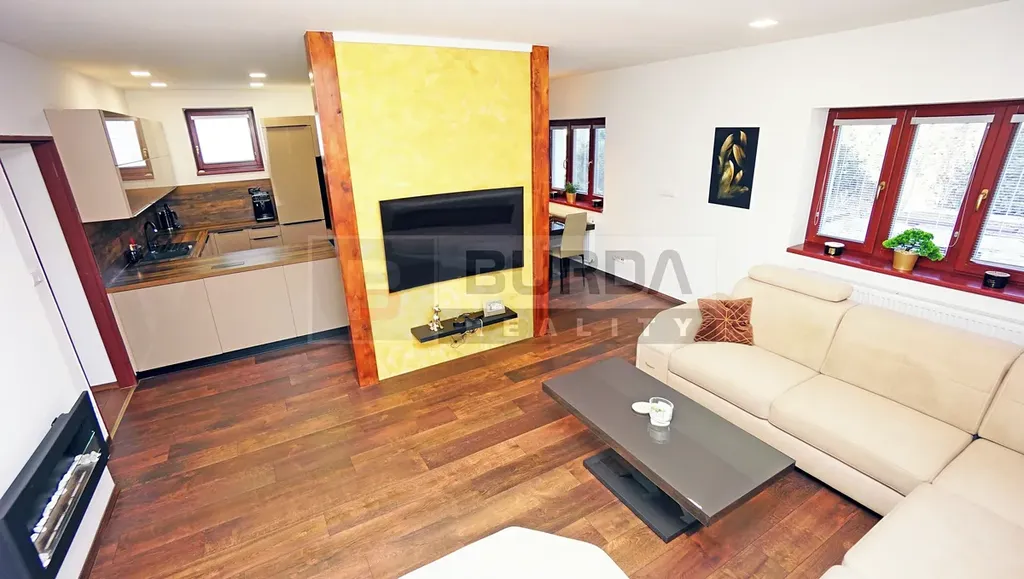 (Měs. poplatky: el. 2200 Kč, voda 840 Kč, net 500 Kč, nádrž plynu na sezonu 30.000 Kč, + provize RK)