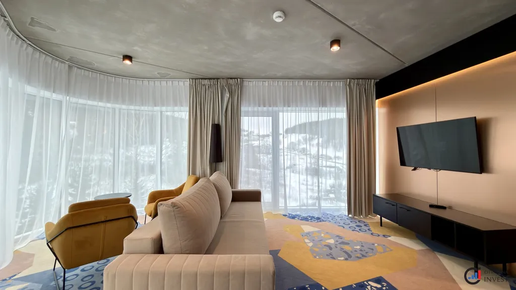 Na tomto krásném místě vám nabízíme apartmán o rozloze 49,08 m² sestávající z obývacího pokoje, ložnice, předsíně a prostorné koupelny se sprchovým koutem i vanou. Apartmán s panoramatickým, zakřiveným prosklením od podlahy ke stropu nabízí krásné výhledy na celý areál. V okolí se nachází restaurace, půjčovny sportovního vybavení a SPA zóna.