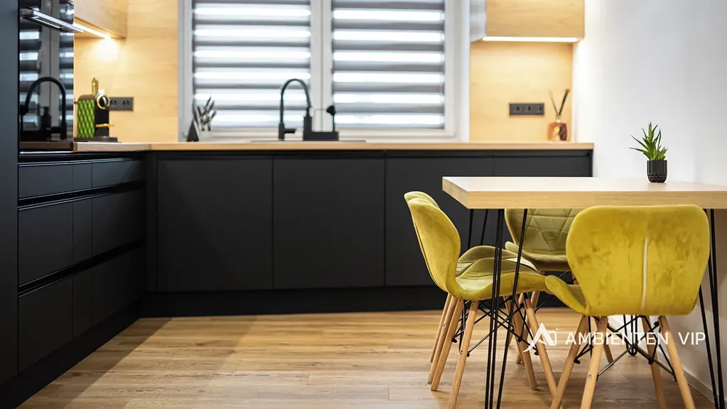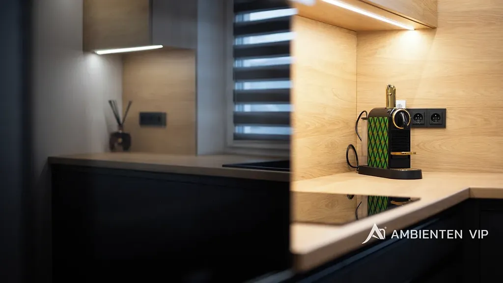 Kuchyňská linka i vestavěný nábytek byly vyrobeny na míru truhlářem, s důrazem na detail, kvalitu materiálů a funkčnost. Kuchyň je vybavena vestavnými spotřebiči značky Whirlpool – lednicí, mrazákem, indukční varnou deskou, myčkou a mikrovlnnou troubou. Interiér dále doplňují bezfalcové dveře, kombinace vinylových podlah a dlažby a plastová okna s trojskly zajišťující tepelný i akustický komfort.