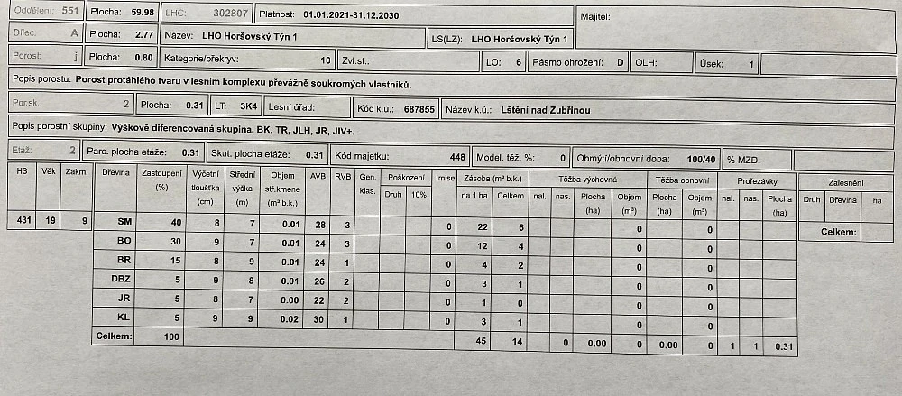 Prodej lesního pozemku v katastrálním území Lštění nad Zubřinou, obec Blížejov, okr. Domažlice. Jedná se o pozemek p.č 501/43 o výměře 6.627 m². Pozemek je situován na rovině až mírně svažitém terénu s přístupem po lesní cestě až k pozemku. Na polovině plochy pozemku se nachází lesní porost smrku, borovice, břízy a javoru ve věku 24 let a na další polovině plochy pozemku proběhla čerstvě těžba lesního porostu. List vlastnictví č. 542. Informace na tel. nebo e-mailu.