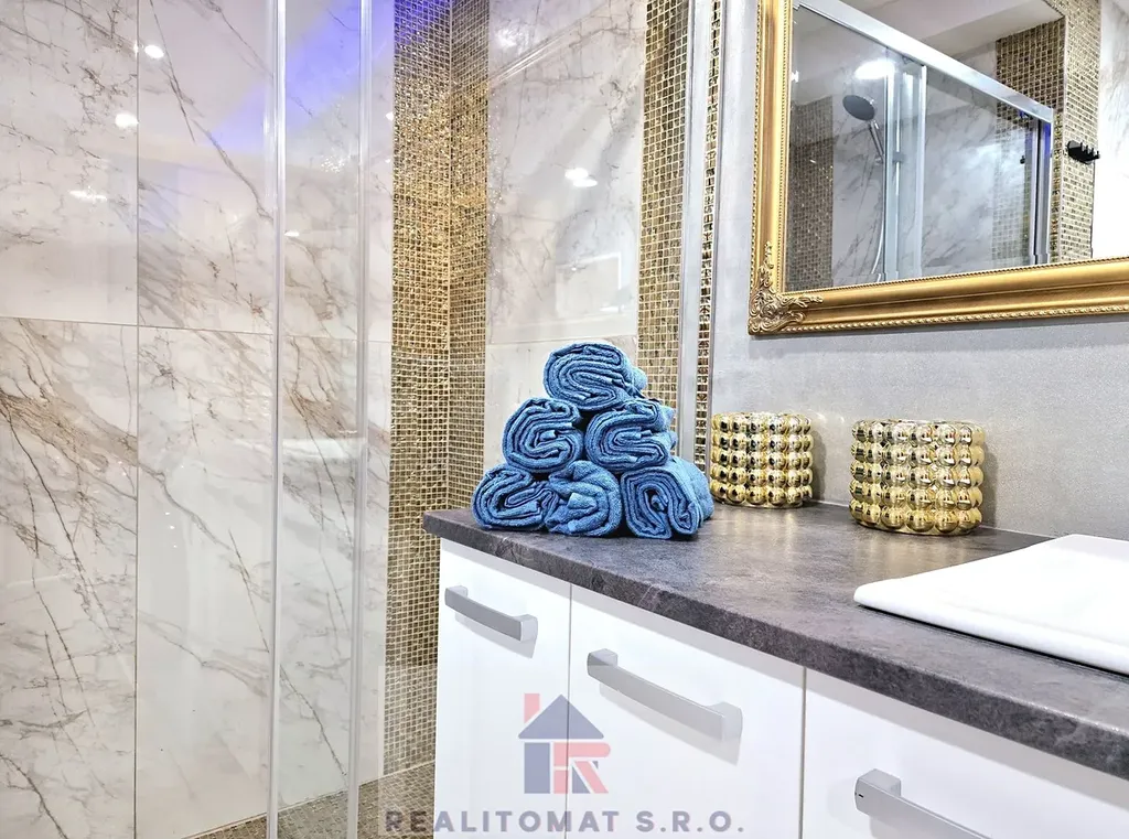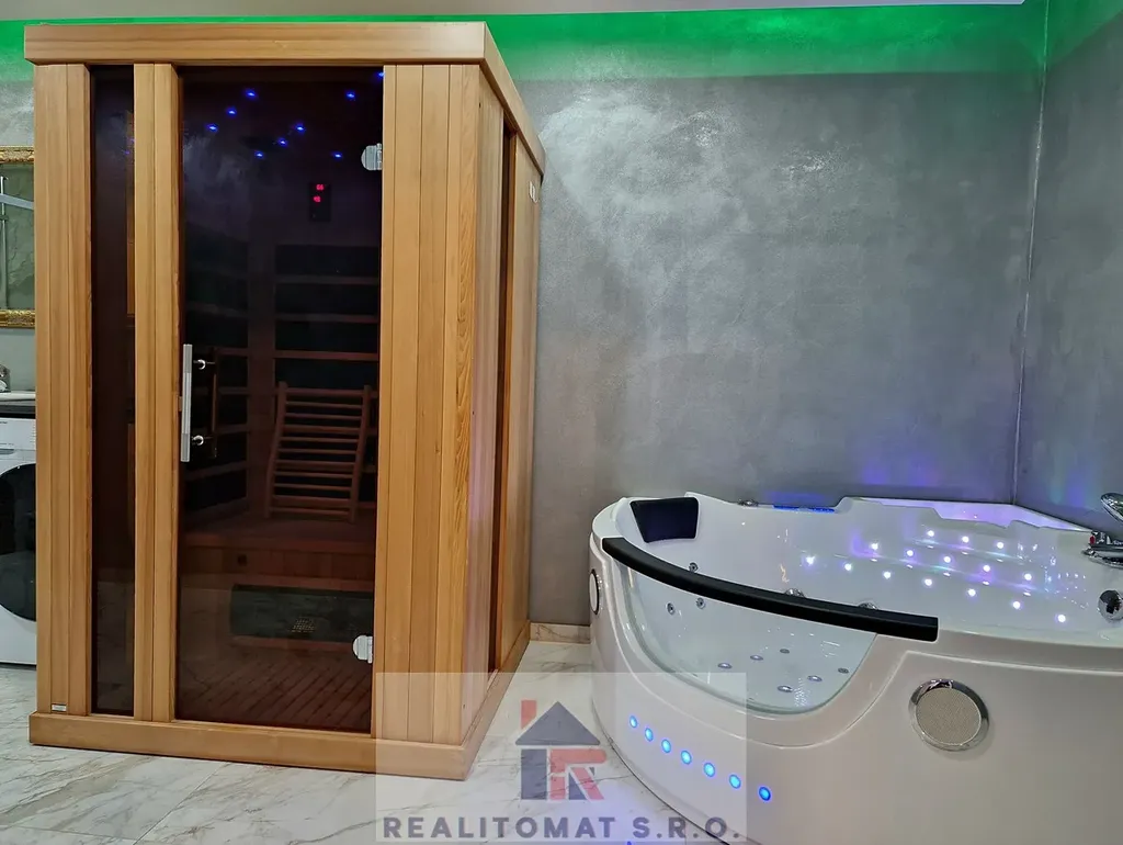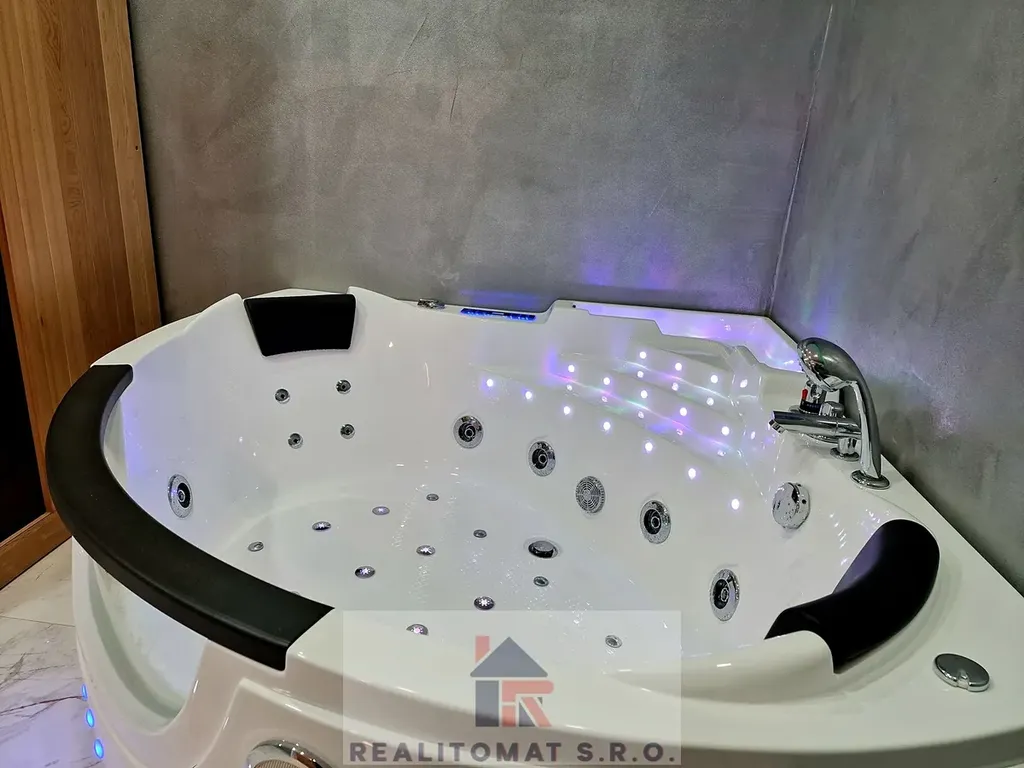 Wellness prostorná koupelna s vířivou hydromasaní vanou pro 2 osoby, led, sauna, sprchový kout.