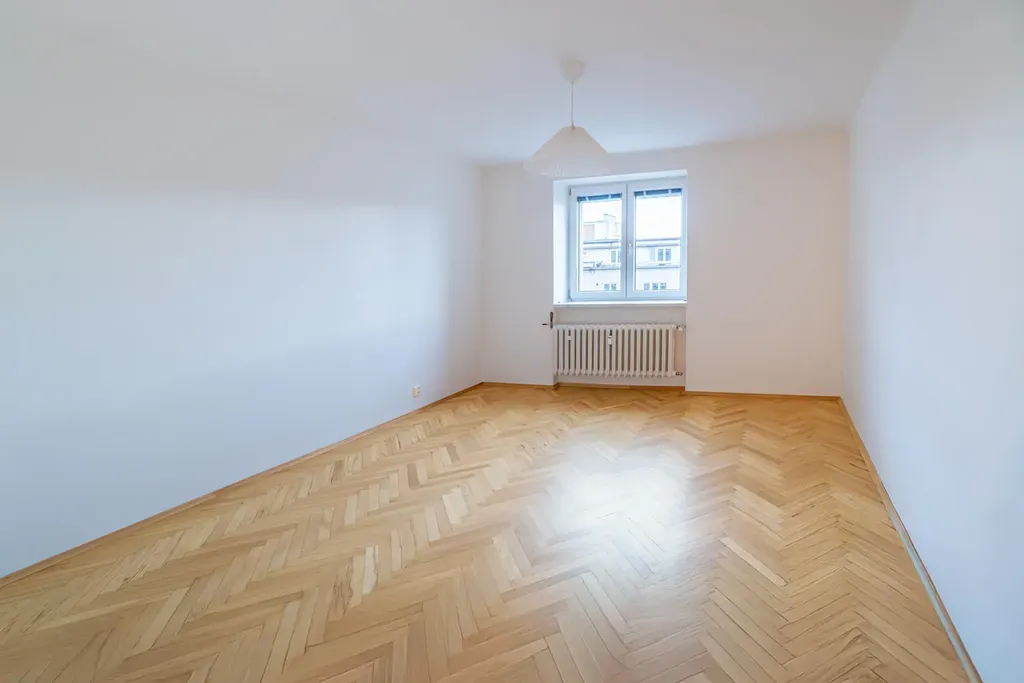 Byt sestává z velice prostorného světlého obývacího pokoje s kuchyňským koutem, který vznikl spojením původní kuchyně a pokoje. Prostor je otevřený do chodby bytu, což mu dodává mimořádnou vzdušnost a ještě umocňuje pocit otevřeného prostoru. Vedle této místnosti je menší pokoj (ložnice) se samostatným vstupem z chodby bytu. Pro inspiraci jsou ve fotogalerii i vizualizace možného zařízení prostoru. V obou místnostech jsou kvalitně renovované parkety. Koupelna i WC jsou rovněž po kompletní kvalitní a vkusné rekonstrukci, v koupelně je připravený přívod na pračku, kterou je rovněž možné umístit vedle kuchyňské linky.