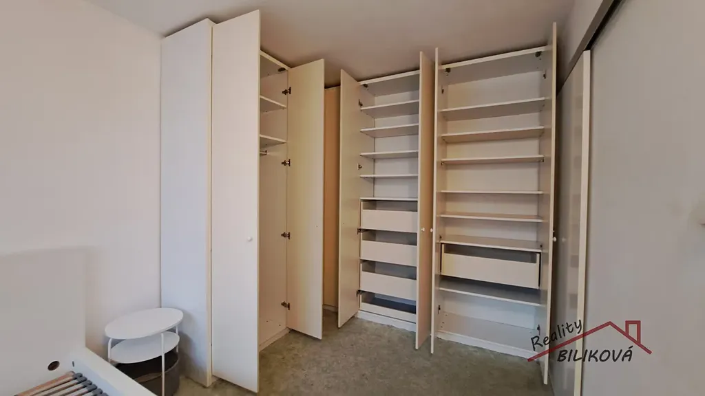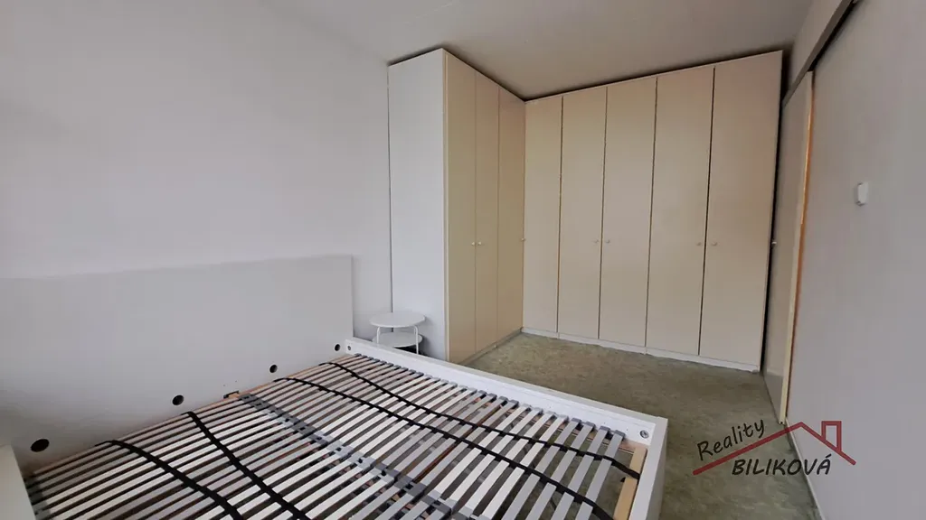 V ložnici vestavěné skříně, dvoulůžko bez matrací. V kuchyni kuch. linka s volně stojícími spotřebiči (lednice, kombinovaný sporák).