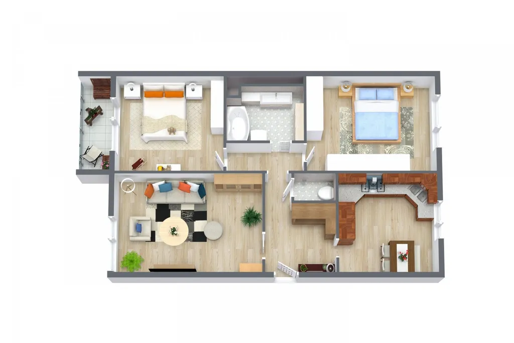 Vizualizace nábytku pro představu dispozice, veškeré fotky aktuálního stavu v galerii.