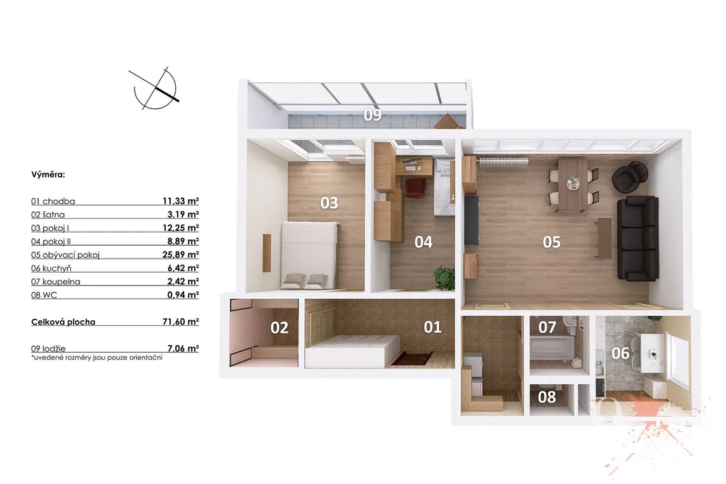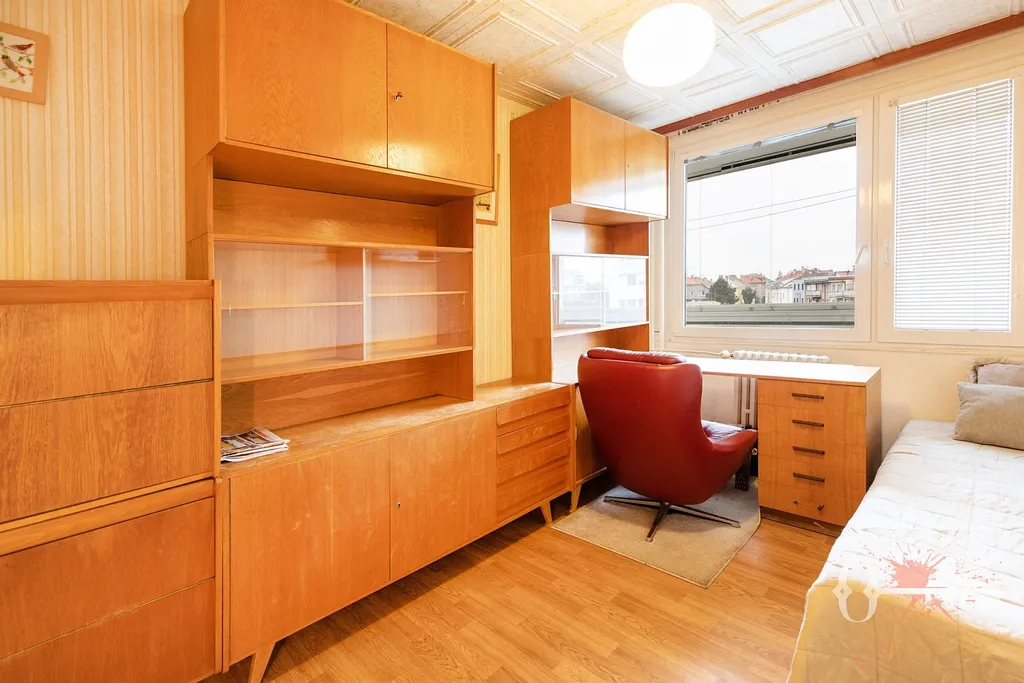 Dispozice je přehledná a praktická. Tři samostatné pokoje poskytují dostatek prostoru pro soukromí i společné chvíle. Samostatná šatna v bytě přináší pořádek a uzamykatelná komora na chodbě nabízí další úložný prostor. Lodžie s výhledem je ideálním místem pro krátký oddech nebo ranní kávu.
