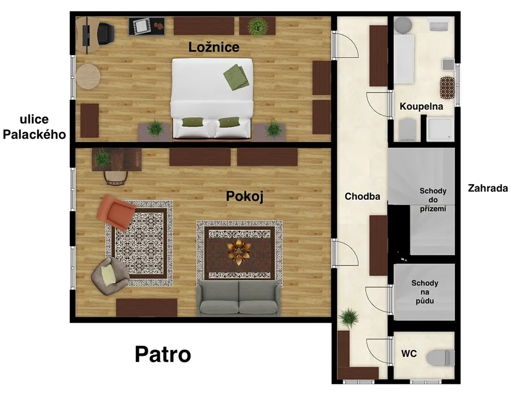 K domu náleží garáž umístěná v zadní části zahrady, která je autem pohodlně přístupná z vedlejší ulice, což zajišťuje maximální komfort pro parkování.