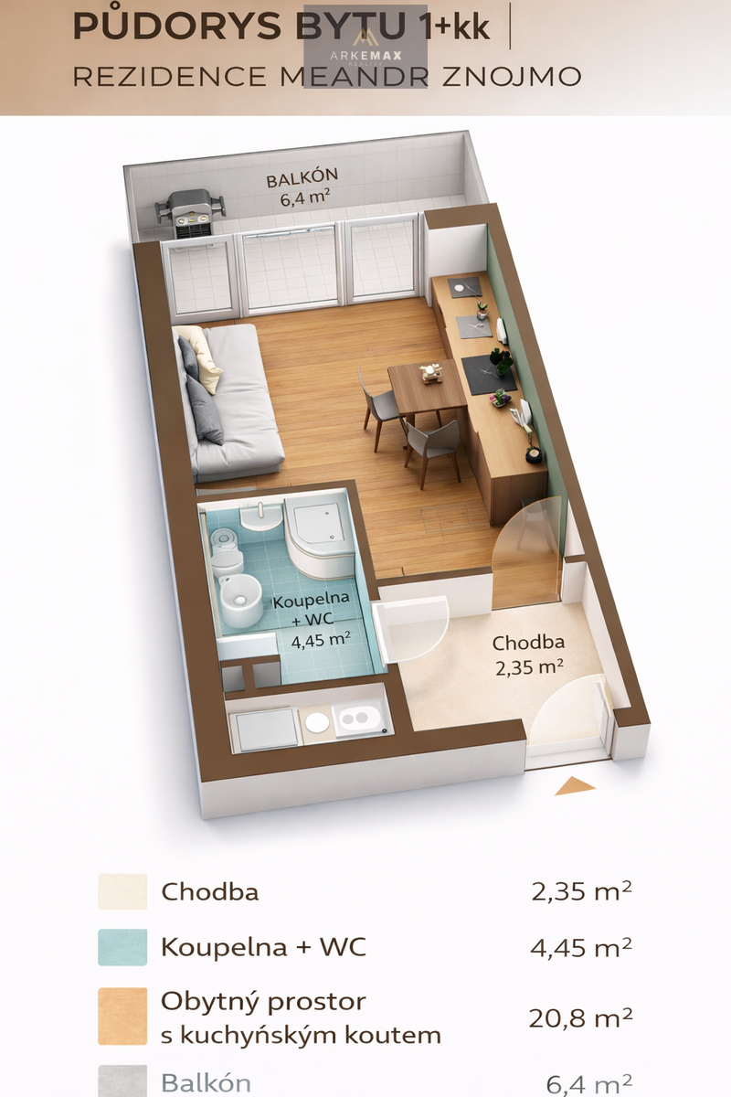 Nabízíme k prodeji byt 1+kk o podlahové ploše 27,6 m² s balkonem 6,4 m² v novém projektu Rezidence Meandr ve Znojmě, část Louka.