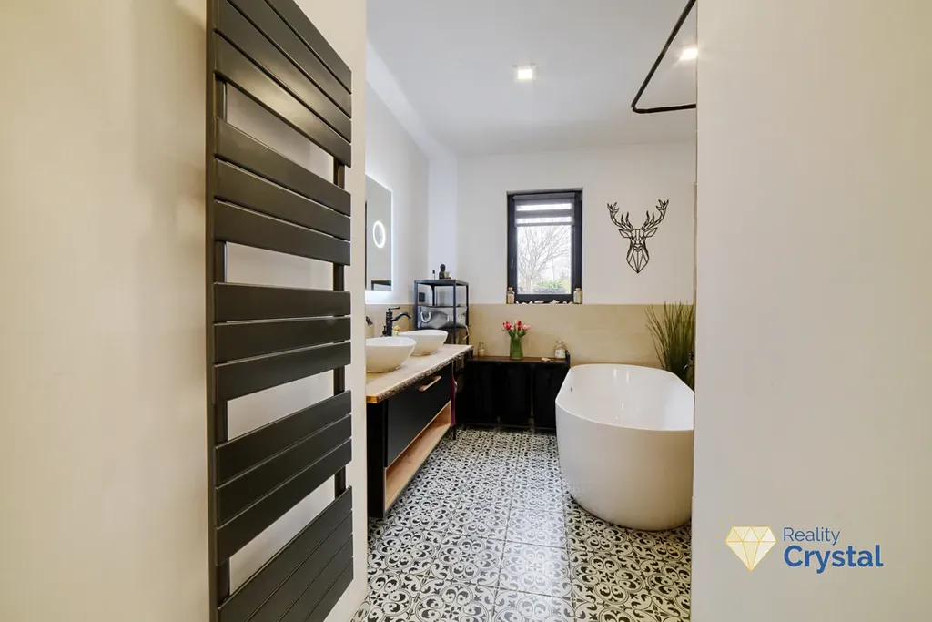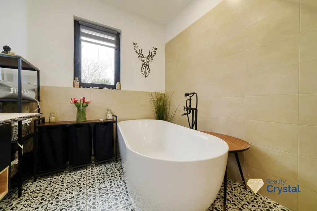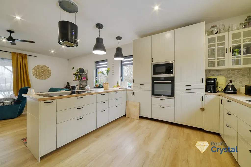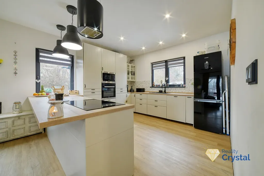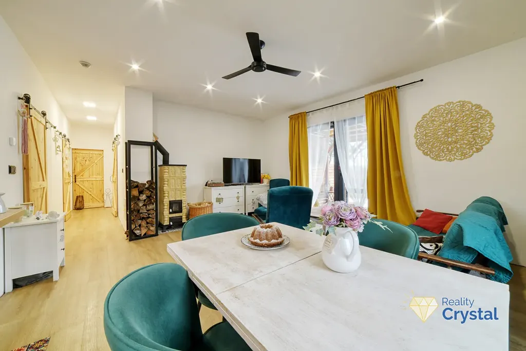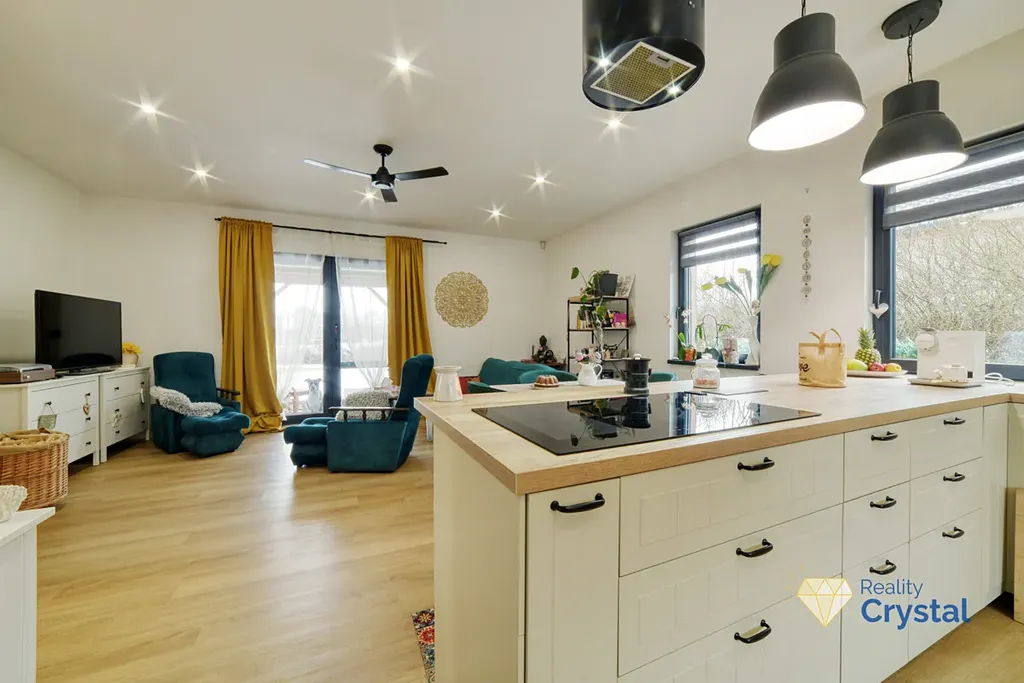 Samostatný dům byl zkolaudován v roce 2021 a spadá do energetické třídy B (velmi úsporná), má dispozici 4+kk a užitnou plochu 110m2. Z obývacího pokoje s kuchyní, který tvoří srdce