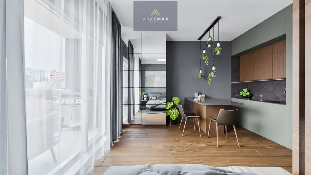 Byt zaujme velkorysým obytným prostorem s kuchyňským koutem o výměře 25,79 m², který umožňuje pohodlné oddělení spací a denní části. Díky velkému prosklení je interiér světlý a vzdušný.