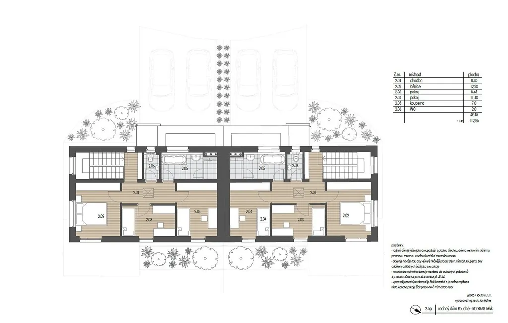 Dispozice: 1.NP - vstupní chodba (7,78m2), koupelna se sprch. koutem, umyvadlem a WC (6,14m2), WC (1,4m2), technická místnost (2,94m2), pokoj (12,20m2), obývací pokoj s kuchyňským koutem (26,86m2), chodba se schodištěm (6,38). Z obýváku je vstup na terasu o výměře 12m2. Plocha parkovacího stání pro 2 auta 36m2.
