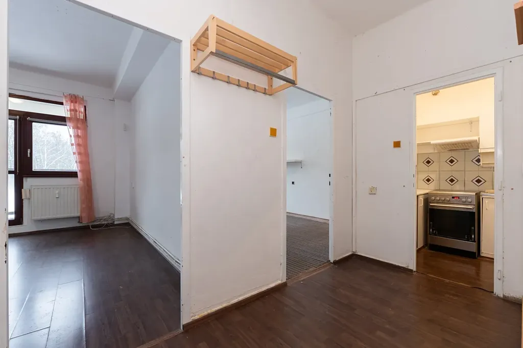 Byt tvoří vstupní chodba, prostorný obývací pokoj s kuchyňským koutem, samostatná ložnice s přímým vstupem na lodžii orientovanou do klidné zeleně, koupelna s vanou a samostatná toaleta. Byt je v původním udržovaném stavu, je vyklizený, bez nájemníků a ihned volný – připraven k rekonstrukci podle představ nového majitele.