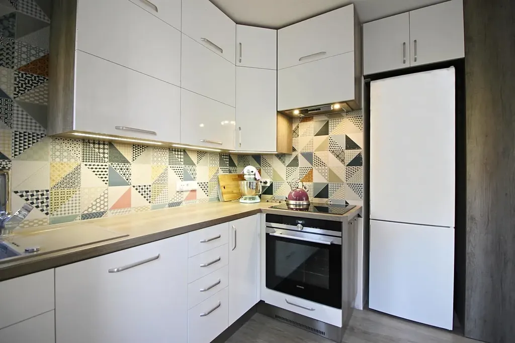 Kuchyňská část je vybavena v moderním stylu s kompletní výbavou, včetně elektrického sporáku s troubou a digestoří, myčky nádobí a lednicí s mrazákem.