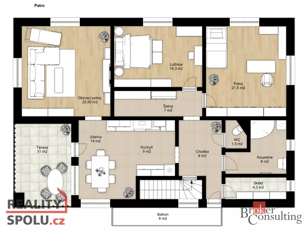 a přímý vstup na krytou terasu s 11m2 i balkon s 5m2.