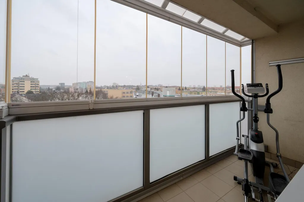 Byt, který vám představujeme, se vám bude líbit, má velice praktické rozmístění jednotlivých místností, na kterém je znát rukopis architekta. Jeho umístění v posledním 7. podlaží zajišťuje světlost, soukromí a výhledy do dálky. Na celkové ploše 72 m2 naleznete hlavní ložnici, druhou ložnici (zařízenou jako pracovnu s hostinským pokojem), dále obývací pokoj otevřený do kuchyně, halu, koupelnu a samostatnou toaletu. Lodžie 5 m2 navazuje na obývací pokoj, je zasklená a slouží jako domácí posilovna.