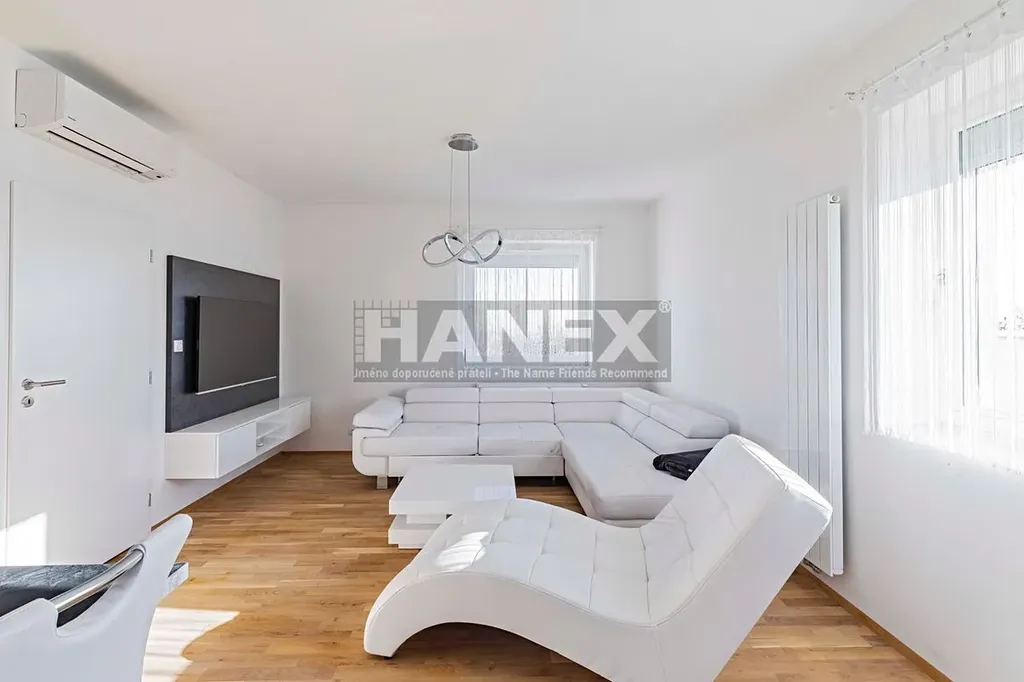 Luxusní kompletně zařízený střešní byt 3+kk (106 m2) s extra velkou terasou (128 m2). Plně klimatizovaný byt se nachází v posledním (2.) patře komorní rezidence s výtahem přímo do jednotky. Interiér bytu tvoří obývací pokoj s jídelním a kuchyňským koutem a vstupem na slunnou terasu s krásným výhledem. Dále jsou zde dvě ložnice, koupelna s vanou, sprchovým koutem, toaletou a samostatná toaleta. Plně vybavená kuchyňská linka v bílém lesku s vestavěnými spotřebiči a snídaňovým barem. Velké množství úložných prostor ve vestavěných skříních na míru v ložnicích i v chodbě. Elektrické rolety v oknech, elektrická markýza na terase. K bytu náleží garážové stání a sklepní kóje (3 m2). Jednotka se nachází v rezidenčním projektu Viladomy Na Vidouli jehož součástí je soukromý parkový areál. Projekt nabízí poklidnou atmosféru v blízkosti golfového hřiště Motol, tenisových kurtů a rozsáhlých parků. Vynikající občanská vybavenost v blízkém okolí a výborná dostupnost nejen do centra města. Pár kroků od domu je stanice autobusu s přímou návazností na linky metra A nebo B. Nákupní a zábavní centrum Metropole Zličín a Galerie Butovice v blízkosti.