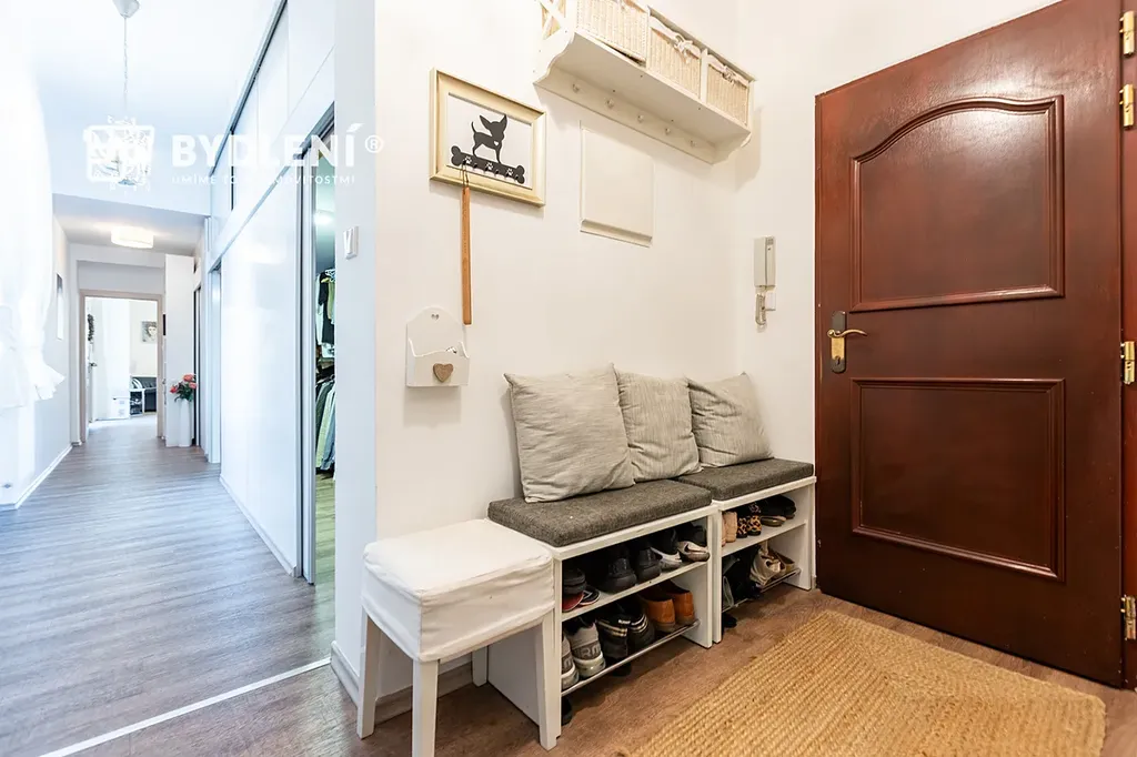 Designová koupelna s dvojicí umyvadel a moderním walk-in sprchovým koutem je oddělená od samostatného WC. Prostorná a okny prosvětlená vstupní hala má po celé délce samostatný uzavřený prostor, který nabízí nadstandardní úložné prostory a samostatnou část vyhrazenou pro technologické zázemí bytu, kde se nachází moderní kondenzační plynový kotel se zásobníkem na TUV a také pračka a sušička.