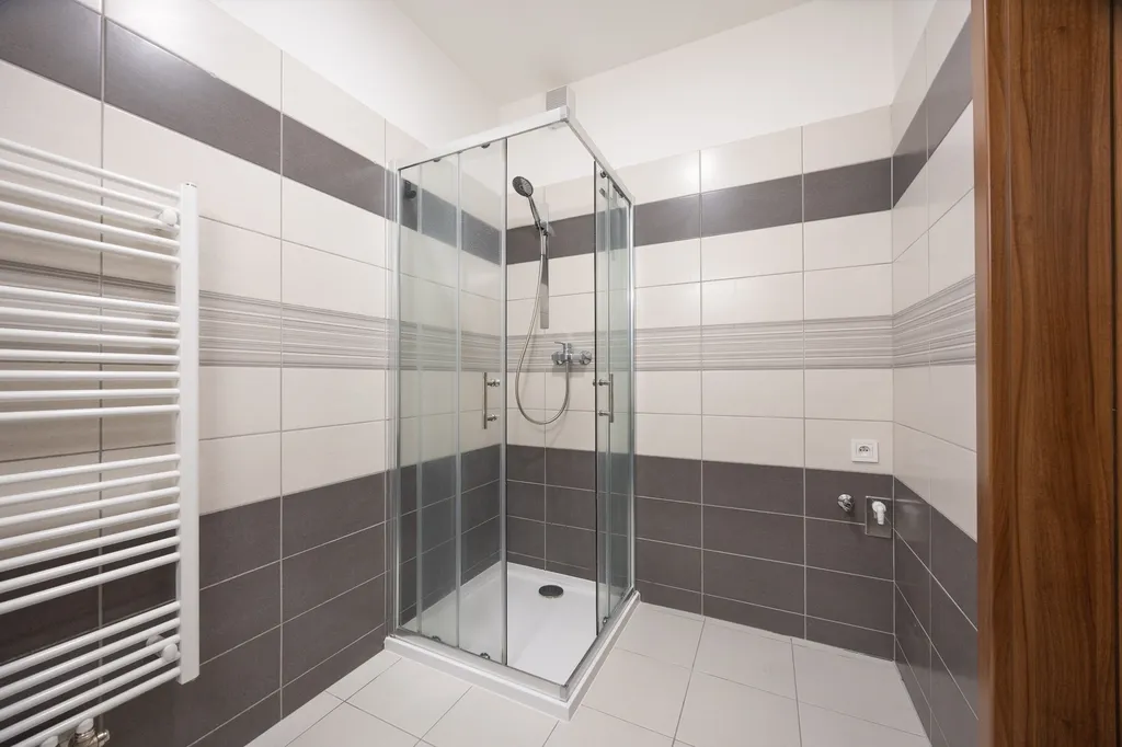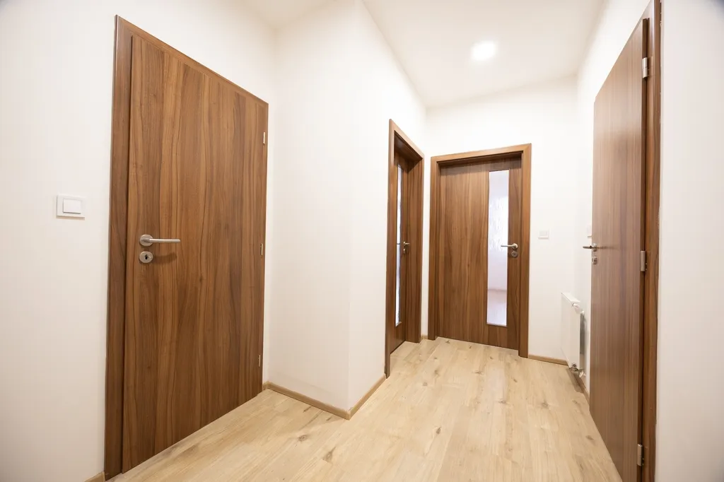 obývací pokoj s kuchyňskou linkou (s přípravou pro myčku), samostatná ložnice, koupelna se sprchovým koutem, samostatné WC, menší komora přímo v bytě.