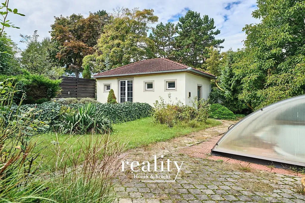 Na zahradě se nachází zastřešený bazén (zde je nutná rekonstrukce) a větší zahradní domek, který byl používán jako ateliér, můžete v něm ubytovat hosty nebo zde vybudovat saunu, či posilovnu.