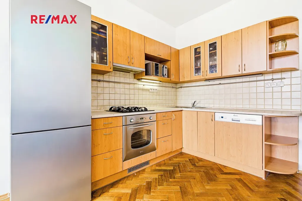 Kuchyňská linka je vybavena plynovým sporákem, troubou, digestoří a myčkou nádobí.