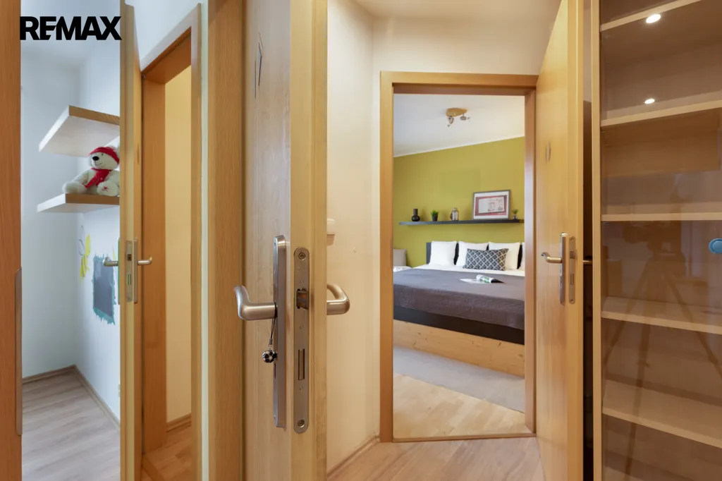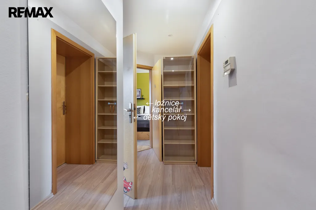 Ložnice a dětský pokoj jsou propojeny důmyslně řešenou šatnou. Prostorný obývací pokoj s jídelnou tvoří srdce bytu – místo pro rodinná setkání i klidné večery.