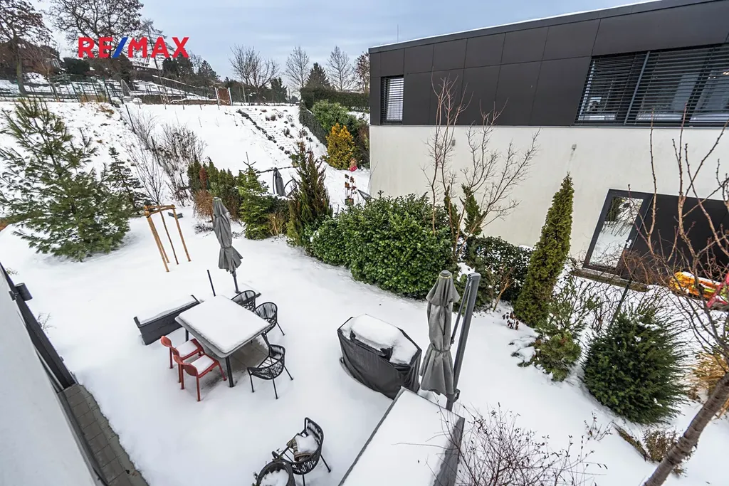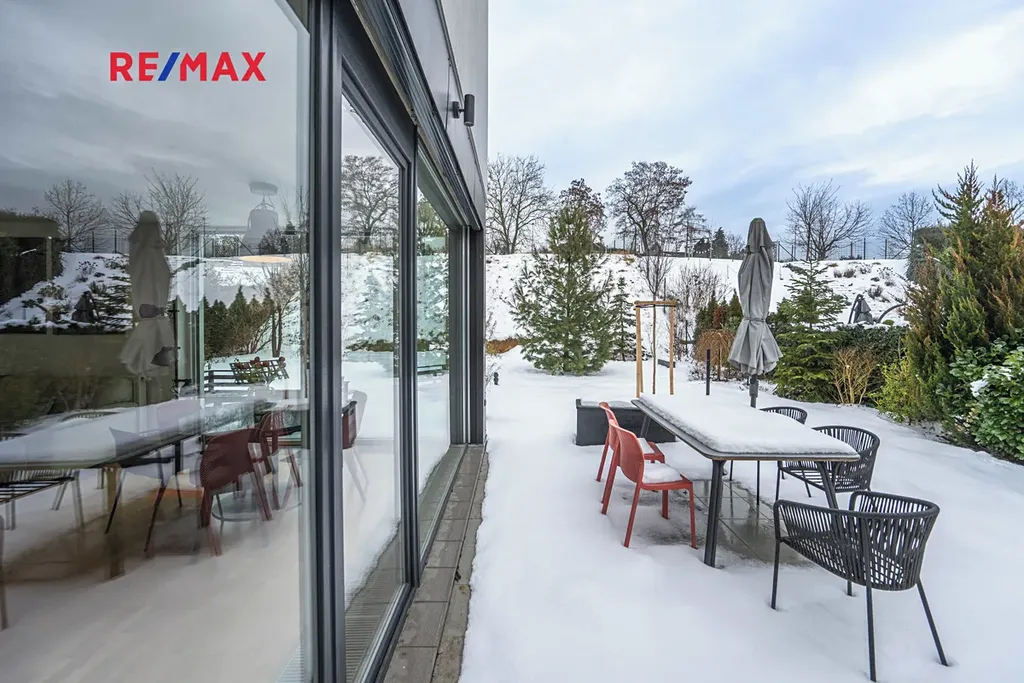 K domu náleží dvě terasy, zařízeny jsou moderním venkovním nábytkem a stíněním. Zahrada se vzrostlou zelení je téměř bezúdržbová, k dispozici je také sezónní bazén a moderní gril.