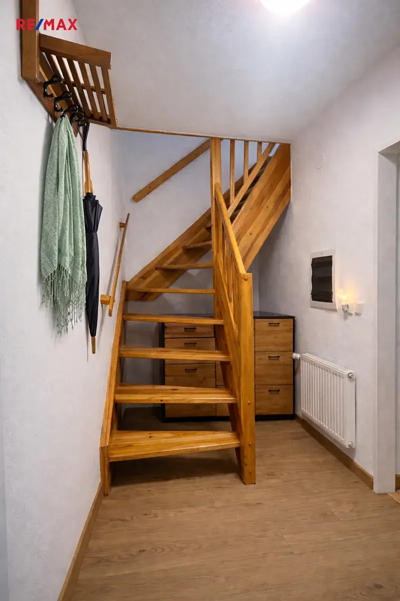 V podkroví jsou tři ložnice. Jedna aktuálně slouží jako šatna. Ústí na prostornou terasu s výhledem na okolí. Menší, velmi dobře udržovaný objekt s menší zahradou, s okrasným záhonem, a sezóním posezením pod přístřeškem.
