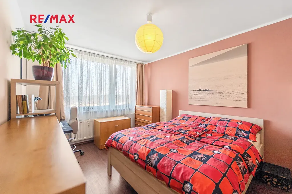 Dispoziční řešení bytu: Vstupní chodba, obývací pokoj s lodžií, šatna, koupelna s WC, pokoj, ložnice. Z ložnice a dětského pokoje je nádherný výhled na Prahu, lodžie nabízí výhled na vilovou zástavbu do zeleně.