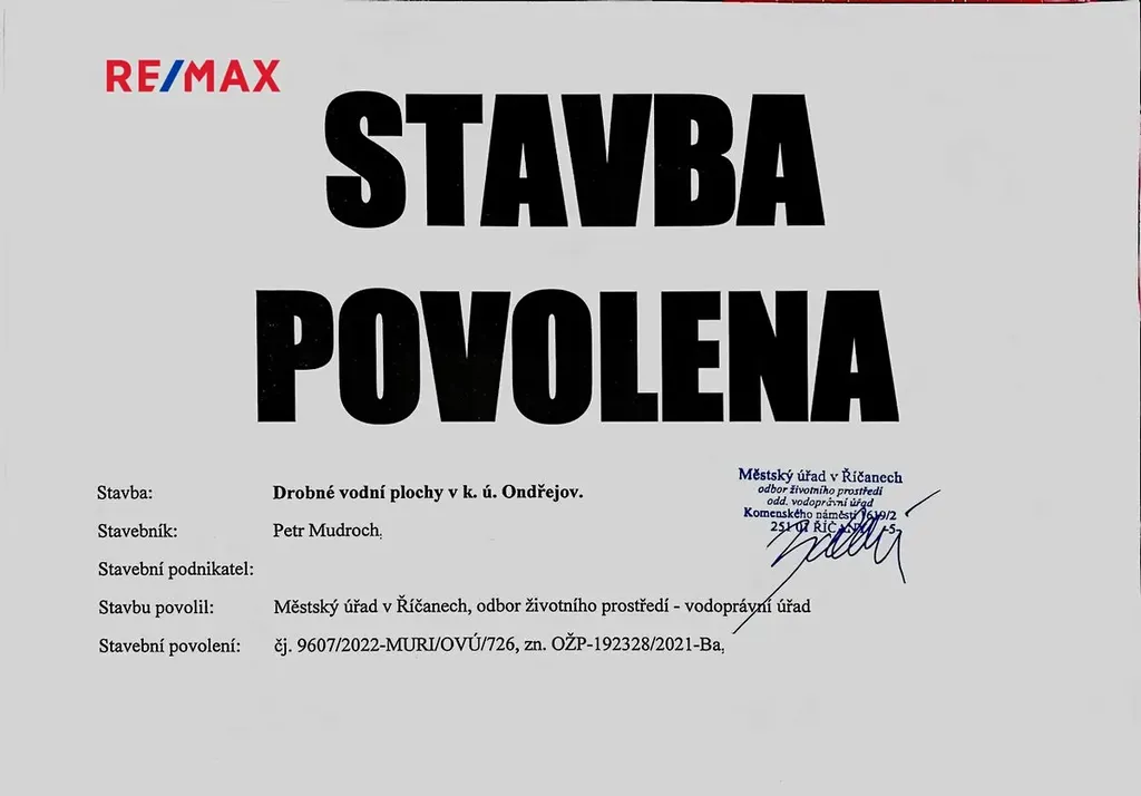 Veškeré vyjadřovačky (a nebylo jich málo) jsou hotové, stačí sednout do bagru a rybník si vybudovat. Dle projektu není potřeba žádný materiál odvážet či likvidovat. Stavební povolení je platné!