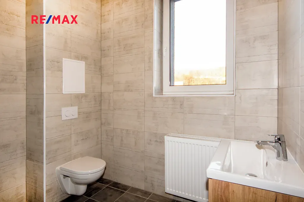 Moderně postavený dům je vytápěn pomocí tepelného čerpadla, rozvod tepla i teplé vody je ústřední.