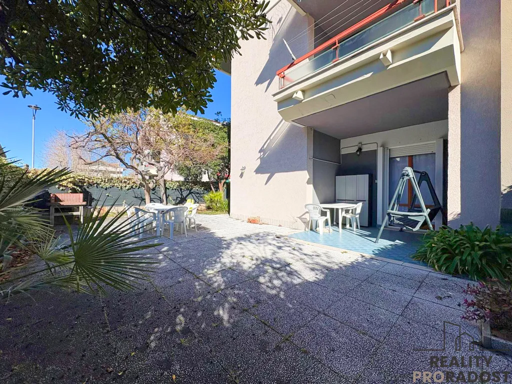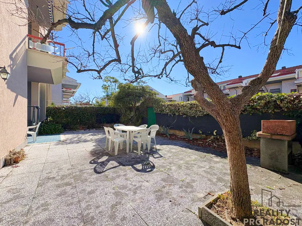 Hlavním benefitem této nemovitosti je rozlehlá soukromá zahrada, která nabízí dostatek prostoru pro odpočinek, posezení i letní stolování. Zahrada je osázena stromy, vybavena barbecue a doplněna o venkovní dlážděnou sprchu, což je ideální zejména v letních měsících po návratu z pláže. Ve všech oknech jsou instalovány sítě proti hmyzu, které zajišťují maximální komfort.