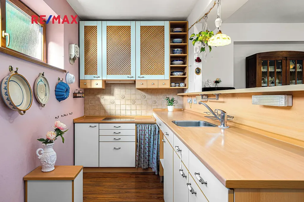 Hlavní místností prostorného rodinného domu je obývací pokoj s kuchyní a s krásnými kachlovými kamny, která zejména v chladných měsících vybízí k příjemného posezení za zvuku praskajícího ohně. Z obývacího pokoje je pak nádherný výhled a přímý vstup do pohádkové zahrady.