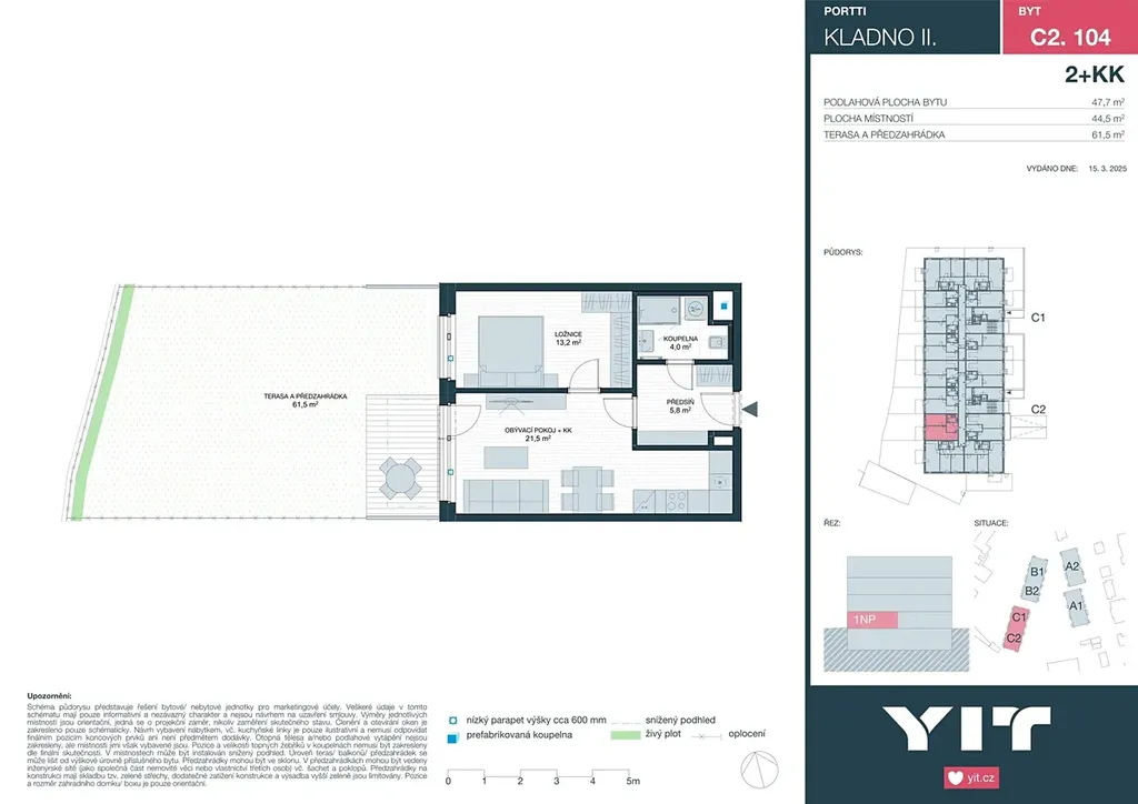 Byt 2+kk o celkové rozloze 47,7 m² s terasou s předzahrádkou 61,5 m² je situován v 1.NP projektu PORTTI Kladno II. Cena zahrnuje bytovou jednotku, sklepní kóji a DPH. K bytu náleží i parkovací stání, které není zahrnuto v ceně. Cena parkovacího stání od 448 000 Kč včetně DPH.