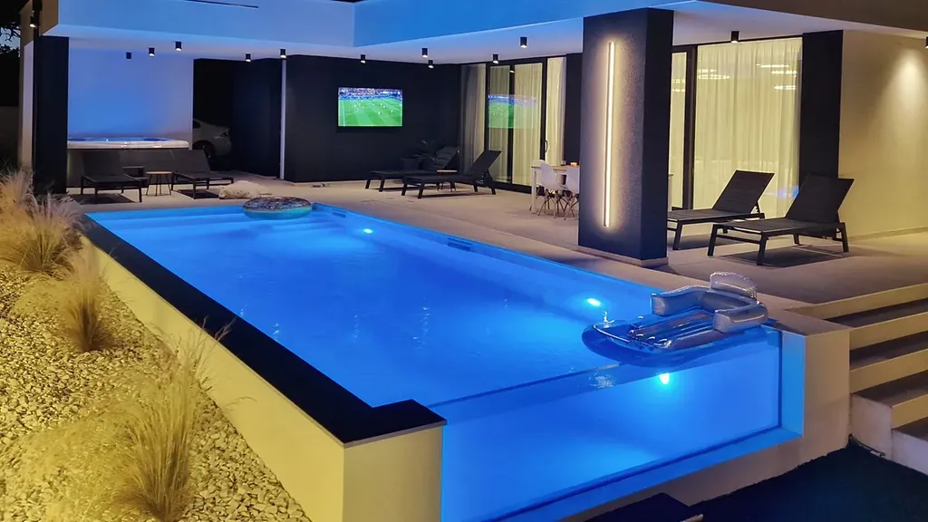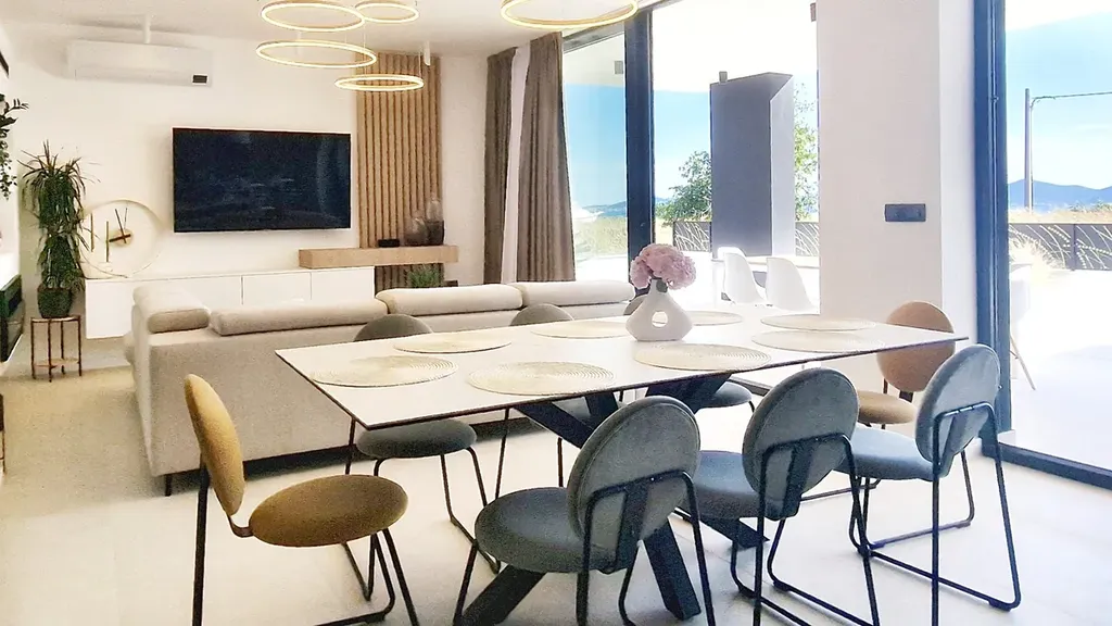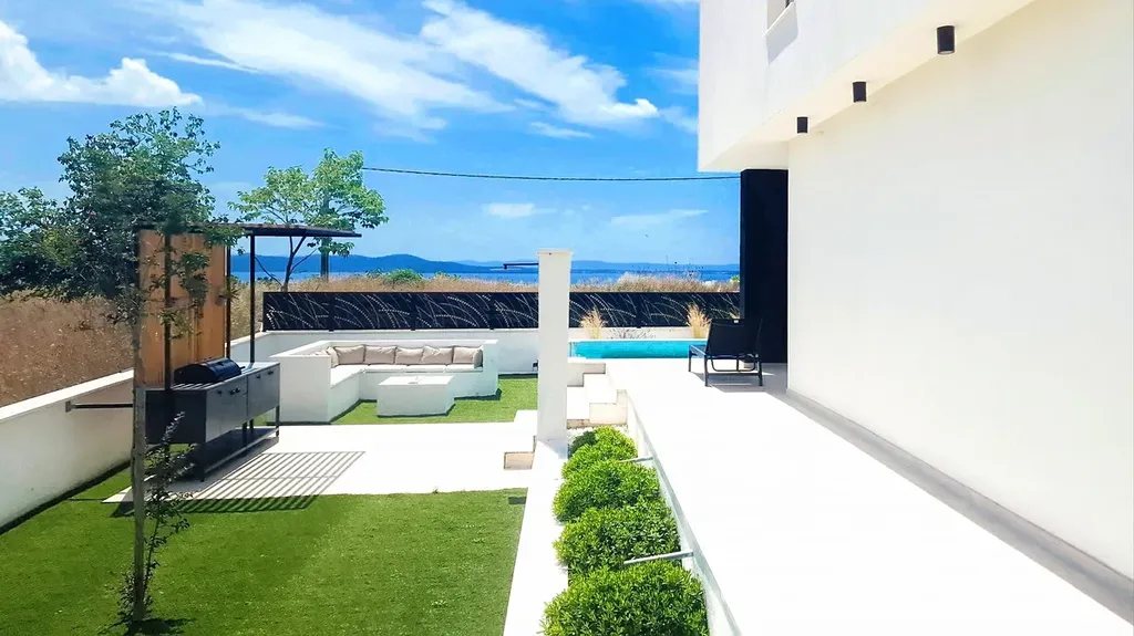 Dům bude mít klimatizaci, podlahové vytápění s tepelným čerpadlem, elektřinu a komín. V přízemí bude keramická dlažba a v pokojích parkety. Na pozemku přímo před domem bude bazén (9x3,5 m), přičemž jedna strana bazénu bude prosklená a z výšky do něj bude stékat vodopád. Na pozemku máte 3 parkovací místa. Vila se nachází v klidné části obce v mírném vyvýšení, díky čemuž nabízí i z přízemí výhled na moře. Dokončení výstavby je naplánováno na duben 2023. Vzdálenost k moři je přibližně 750 m.