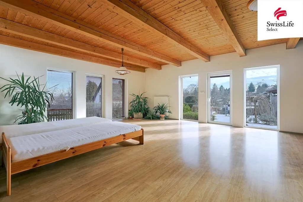 V podkroví jsou tři pokoje - jeden s balkonem, dále prostorná šatna, WC a koupelna se sprchou. Je zde také klimatizace.