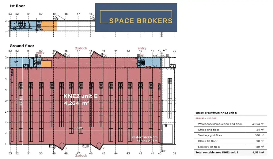 Hala 1 - nabízí 4.054 m2 skladovacích prostor a 497 m2 kancelářského a sociálního zázemí pro zaměstnance