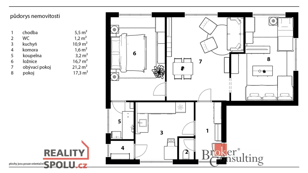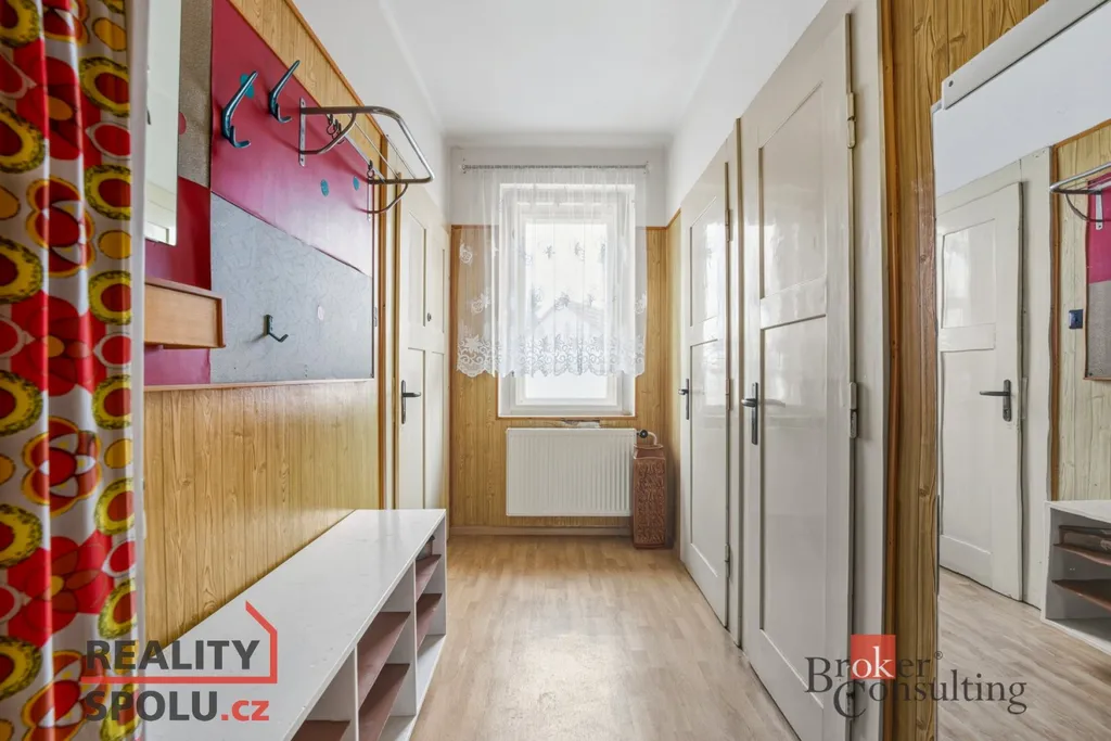 Dispozice zahrnuje předsíň, kuchyni, obývací pokoj, dva samostatné pokoje, spižírnu, koupelnu a samostatné WC. Prostory jsou vhodné pro rodinu, pár i jednotlivce, kteří hledají klidné bydlení s výbornou dostupností veškeré občanské vybavenosti.